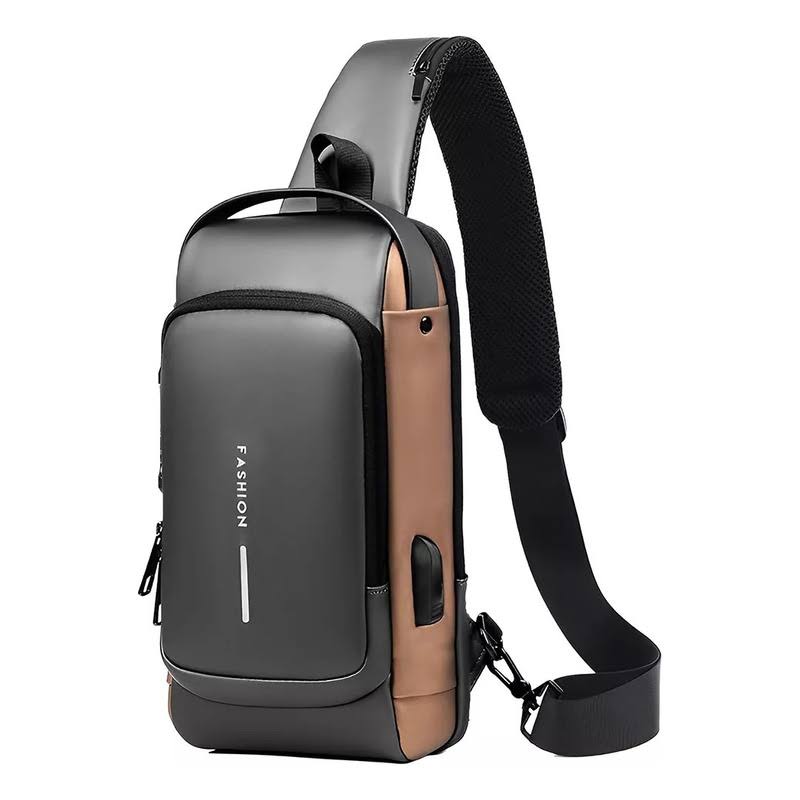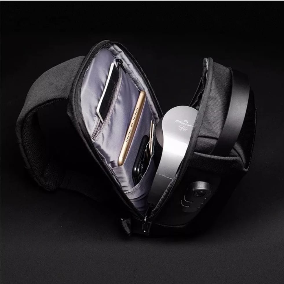 CARACTERÍSTICAS Tamaño: 31x 17 x 7 cm Material : tela Oxford 1 bolsa de carga USB deportiva Con mecanismo antirrobo. Con cierre. Es impermeable. Con correa de pecho. Tiene 7 bolsillos.